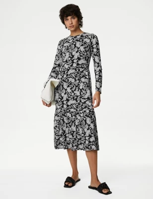 Jersey Printed Round Neck Midi Tiered Dress