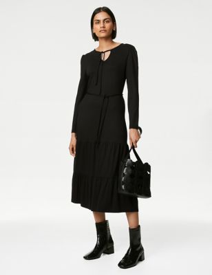 Jersey Tie Neck Belted Midaxi Tiered Dress