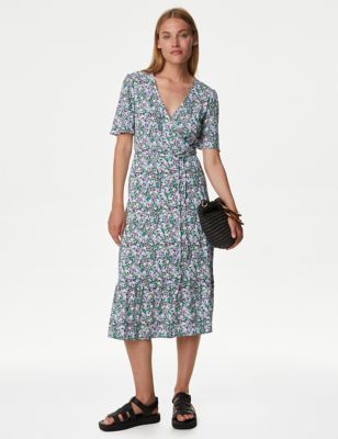 Jersey Printed V-Neck Midi Wrap Dress