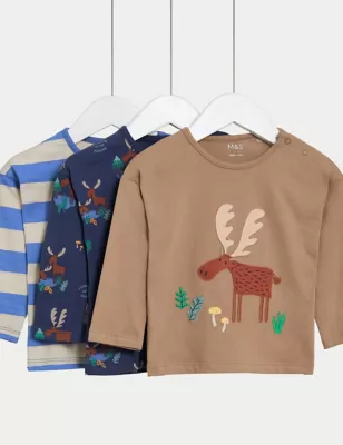 3pk Pure Cotton Moose & Striped Tops (0-3 Yrs)