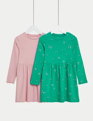 2pk Cotton Rich Floral & Ribbed Dresses (2-8 Yrs)