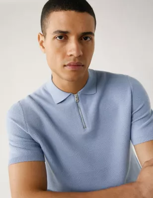 Cotton Rich Zip Up Knitted Polo Shirt