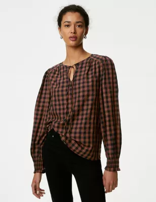 Modal Rich Checked Tie Neck Blouse