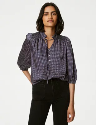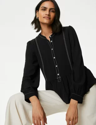 Cotton Blend Button Through Popover Blouse